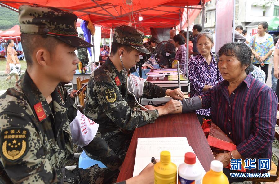 在四川长宁地震灾区安置点,武警宜宾支队卫生队党小组成员为群众提供医疗服务(6月20日摄)。