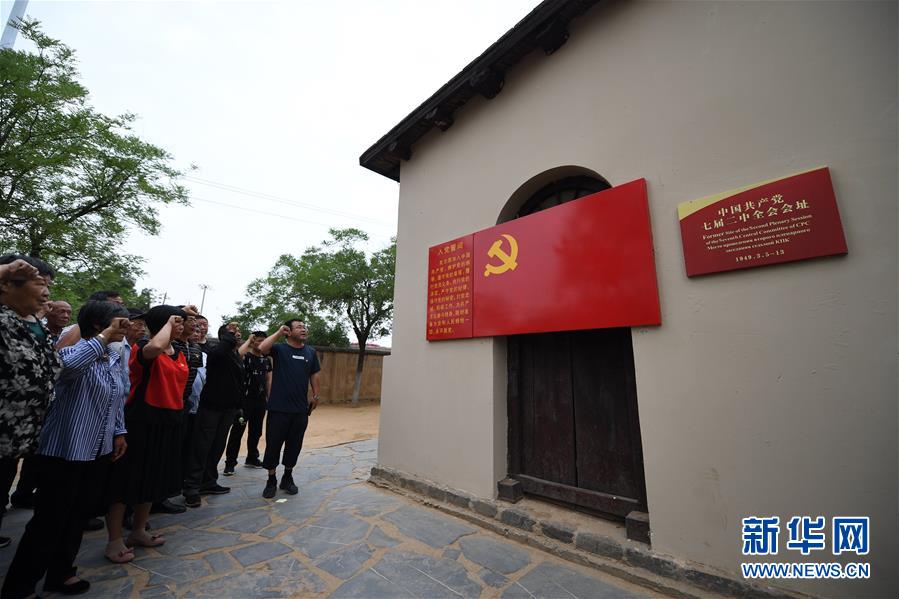 在河北西柏坡中国共产党七届二中全会会址,党员重温入党誓词(6月20日摄)。