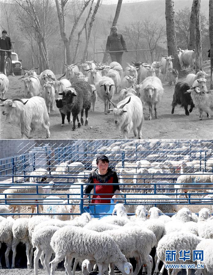 这是一张拼版照片,上图为1993年4月27日,陕西省延安市梁村乡的白生有老汉在放养自家的羊群;下图为2019年4月23日,延安市安塞区化子坪镇河西沟湖羊养殖场的工作人员在喂羊。