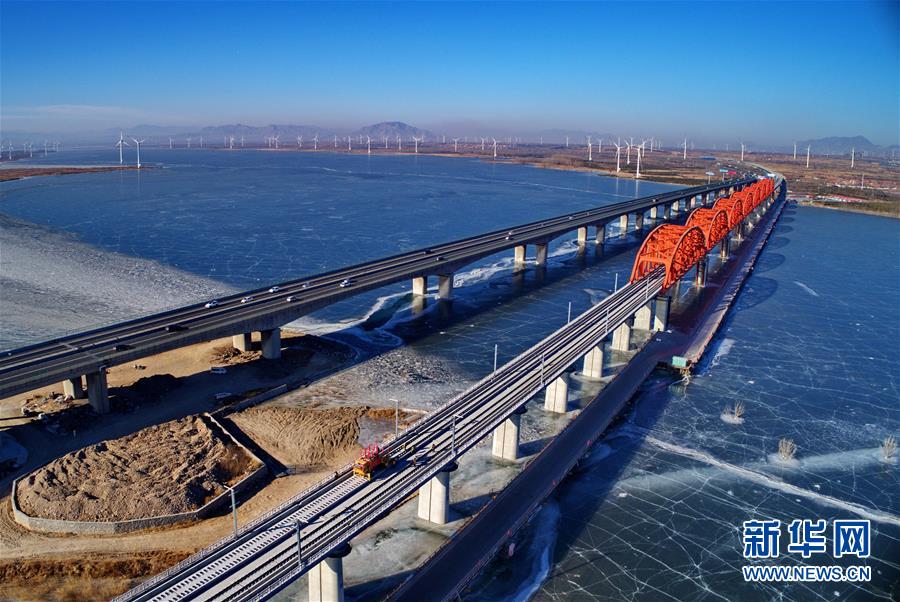 中铁三局工人在河北张家口京张高铁官厅水库特大桥进行铺轨作业(1月13日无人机拍摄)。