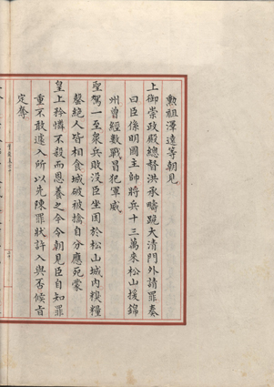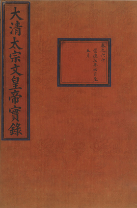实录是记述一朝皇帝统治时期各种活动的编年体大事记。清代沿袭旧制,每朝皇帝死后由嗣位皇帝命大臣开实录馆纂修前朝实录。实录每修两部,一部存京城,一部送盛京保存,京城一部实录有满、汉、蒙三种文本,盛京一部有满、汉两种文本。实录的函、册均用红绫装裱,数函用黄绫包成一包。实录用宣纸书写,内画朱丝栏,墨笔楷书,内容涉及清代政治、经济、军事、外交、文化、民族、宗教各个方面。