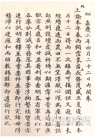 在古代,农业生产基本上是“靠天吃饭”,如果雨水少必然会影响农作物的生长,致使君民皆忧。这在清档中也多有记述,例如,乾隆二年(1737)三月二十六日,乾隆帝就发布上谕:“立夏前后,再无雨泽则秋田难于播种,小民恐有艰食之虞”,提醒官员要特别注意因雨水少导致播种困难的情况。嘉庆二年(1797)四月二十二日的上谕中也提到当年的春季雨水还可以,麦苗长势也不错,可立夏后只下过一场雨,虽“尚可接润”,但又有好几天“未经续获透雨,农田不无望泽”,对此,嘉庆帝甚为关切,特别要求按照惯例设坛虔诚祈祷,“以期渥霈甘膏”。同治帝也曾在登基的第四年(1865)立夏时,为了祈雨专门前往大高殿拈香,还分派惇亲王奕誴等,到时应宫等处拈香,以期“农田望雨弥殷,再申祈祷以冀叠沛甘霖”。