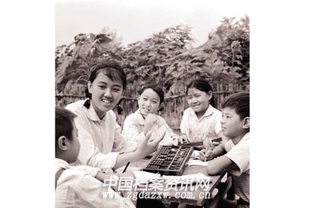 1973年,山东省青岛市知青王琳到昌邑县落户插队后担任了村民办教师。图为她正在指导学生学珠算。 山东省档案馆藏