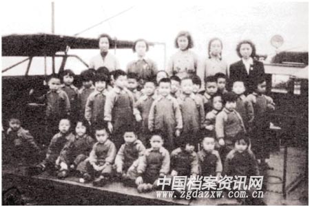 1949年6月,华东保育院的孩子和工作人员在南下上海途中合影。 山东省档案馆藏