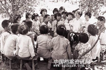 1979年6月1日,山东省济南市机床八厂幼儿园的孩子们正在听老师讲故事。 山东省档案馆藏