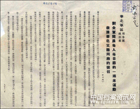 为了在困难时期,减轻人民群众的负担、救济受灾同胞,1949年9月12日,华北军区司令部、政治部发出《对全军开展每人每日节约一两米运动救济华北灾难同胞的号召》,提出: