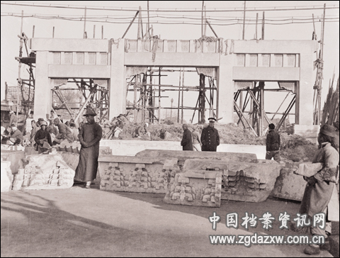 1918年,克林德碑石牌坊北侧搭建了脚手架,顶部的构件已被陆续拆下来码放在地上。