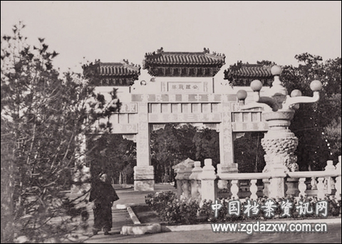 照片中石牌坊楼顶中间可见“公理战胜”四个大字。此照片摄于20世纪30年代的中央公园。