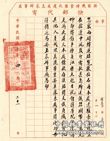 1941年4月21日,浙区战时食盐收运处玉泉办事处所发,关于派遣专人携款操办转移存盐之事的特急第一号快邮代电。