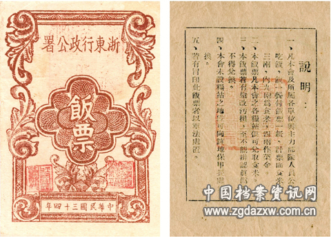 为适应游击战争的需要,浙东抗日根据地开始组织饭票和粮票的统一印制,发放对象主要是下乡军政人员和过往部队。饭票可以随时兑换,并且能够抵缴公粮,解决了军政人员深入群众,开展工作时的吃饭问题。各过往队伍和下乡干部,可凭票向经过地或到达地领取食米。饭票和粮票看上去是一种领物券,但从本质上来说,由于持有者可凭票领粮吃饭,收受者可凭此来抵交公粮田赋,所以它又不只是一种普通的票券,同时还具备着货币的性质。