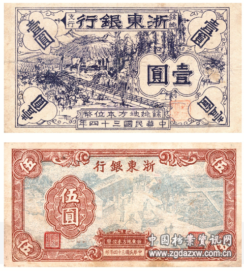 1945年,浙东银行发行的1元和5元面值的“抗币”。