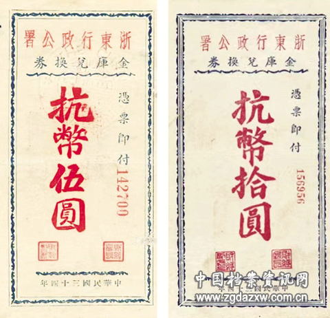 1945年,浙东行政公署发行的“抗币5元”和“抗币10元”的金库兑换券。