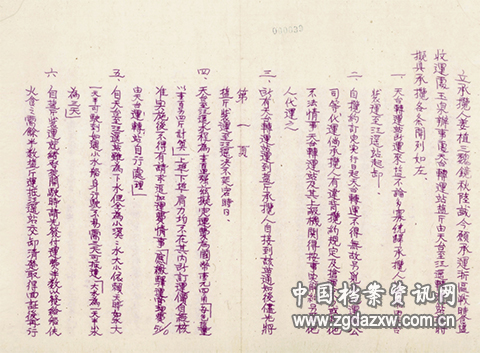 1941年,浙区战时食盐收运处玉泉办事处天台转运站订定的转运承包合同(部分)。