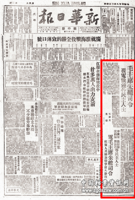 1949年北平和平解放后,李济深、沈钧儒、马叙伦、郭沫若等人于2月1日联名致电毛泽东、朱德,庆祝人民解放战争的伟大胜利,“我人民解放大军,乃人民之武力,革命之前锋”,“叠奉捷音,不胜振奋。窃愿竭力追随,加紧团结,为中国之建设奋斗到底”。次日,两人联名复电:“来电读悉,极感盛意。中华民族与中国人民的解放斗争,百余年来,前仆后继。无数先烈的鲜血,洒遍了锦绣山河;亿兆后起的人民,表现了英雄气概。此次人民解放战争之所以胜利,是由于全国人民不畏强御,团结奋斗,各民主党派各人民团体一致奋起,相与协力,从而使人民解放军获得各方面的援助,使人民的敌人完全陷于孤立,胜负之数,因以判明。现在残敌尚存,诡谋时作。求喘息谓为求和平,待外援名曰待谈判。口诵八条,手庇战犯,眼望美国,脚向广州。欲求人民解放斗争获得最后胜利,必须全国一切民主力量同德同心,再接再厉,为真正民主的和平而奋斗。诸先生长期为民主事业而努力,现在到达解放区,必能使建设新中国的共同事业获得迅速的成功。”