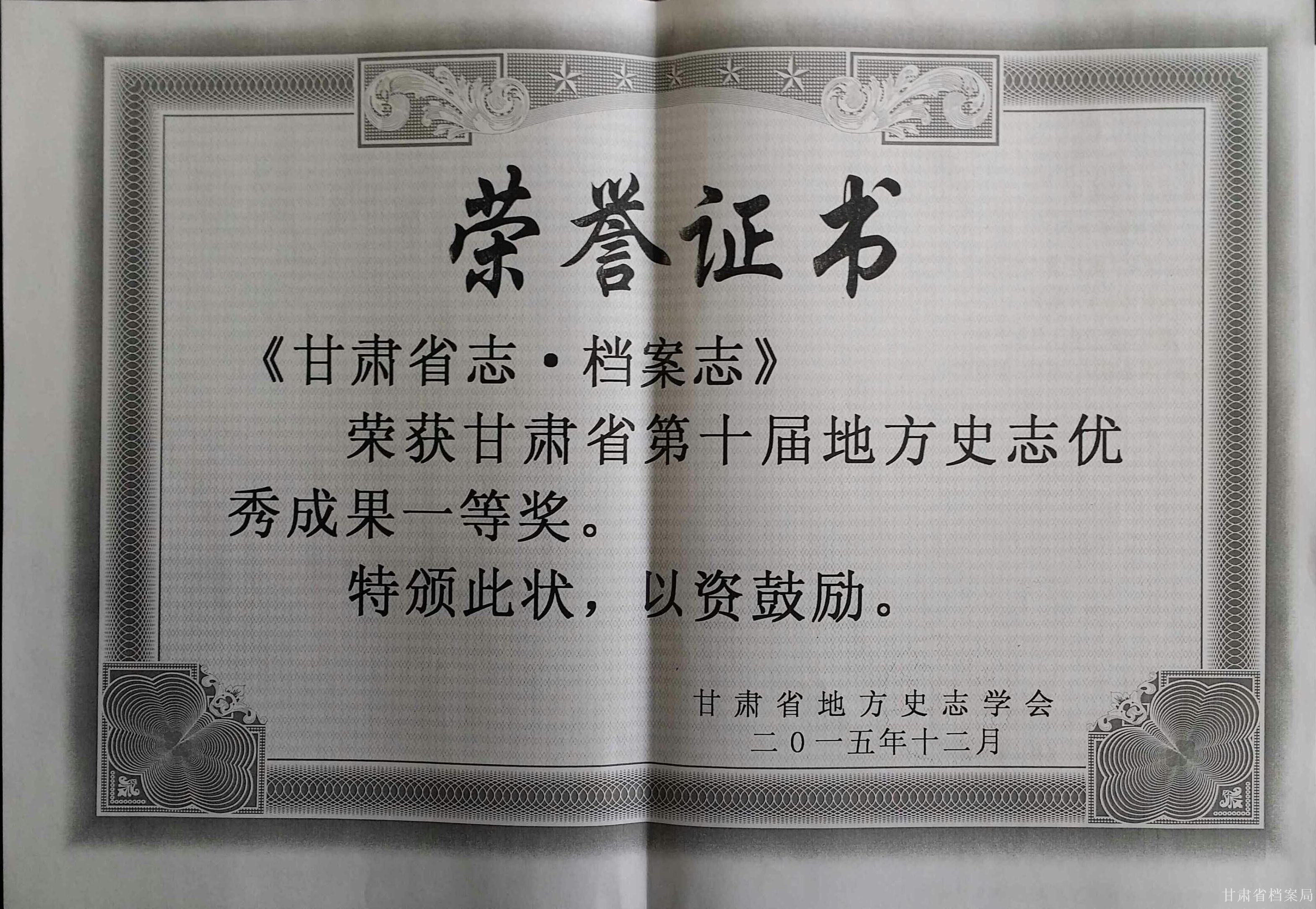 省档案局2013年编写出版的《甘肃省志·档案志》,在甘肃省地方史志编纂委员会、甘肃省地方史志学会组织开展的全省第十届优秀史志成果评奖活动中荣获一等奖。这次评选活动中,共有80多项成果参加评审。《甘肃省志·档案志》在志书类成果中脱颖而出,为档案部门争得了荣誉,代表了我省地方志工作的最新成就,丰富了甘肃史籍的门类和数量,在全省"三个文明”建设中发挥了重要作用。