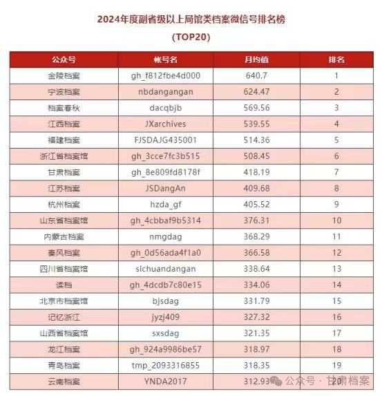 1月20日,全国档案社媒联盟发布“2024年度全国档案微信公众号排行榜”,“甘肃档案”微信公众号以WCI(微信传播指数)月均值418.19分位列副省级以上局馆类档案微信号排名榜第七名。