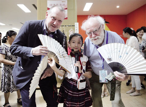 星汇学校学生向外国档案专家赠送自己制作的手绘折扇 王颖华 摄