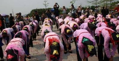 孩子们远去了,但是总忘不了养育他们的母娘岩。于是,每一年的二月十九布洛陀生日这一天,布洛陀与母勒甲的孩子们,便携带着自己的孩子、孙子,不约而同地从四面八方回来,给布洛陀祖公和母勒甲姆娘拜寿。由于子子孙孙太多,路途近的先来,能进母娘岩给布洛陀、母勒甲拜寿,路远后到的子孙则从洞口挤到山脚排成长队等候。而这时,还在山脚等候的人待不住了,由于拜寿心切,他们纷纷就地引火烧香,香火一直从山脚插到母娘岩洞口,形成了一条香火长龙。等到拜寿结束时,已经是三月初七、初八这几天了。这是,子孙们看到自己老祖宗虽然子孙无数,都仍然那样精神健康,长寿不老,个个兴高采烈,山前山后欢欣鼓舞。