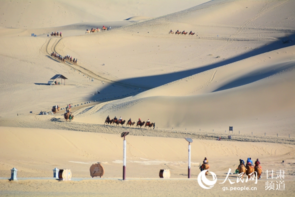 行进在鸣沙山·月牙泉景区中的驼队(王文嘉 摄)