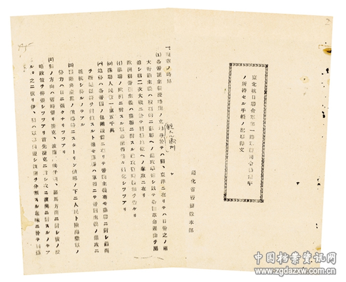 这份编号“通省警特秘第一五三七号”的机密文件,是1940年3月16日伪通化省警务厅厅长岸谷隆一郎发给柳河县警务科的杨靖宇笔记本译文。2月23日,铁血将军杨靖宇血洒濛江,壮烈殉国。他身上的笔记本被日伪军警掳获,其内容被紧急译成日文,作为“讨伐”东北抗日联军的情报。而在伪满政权灭亡之际,伪通化省公署、警务厅及其所辖各县公署、警察署开始大规模焚烧档案,许多政务、警务活动档案均被销毁。该文件被夹藏在一堆零散的材料中,得以留存。