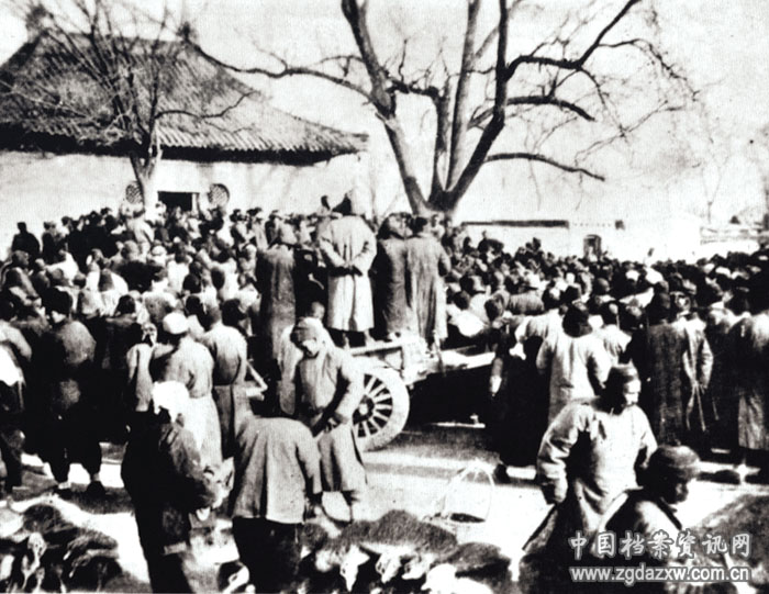 “一二·九”运动后期,平津学生南下扩大宣传团成立,学生运动开始走向与工农相结合的道路。图为宣传团在河北固安进行抗日宣传。