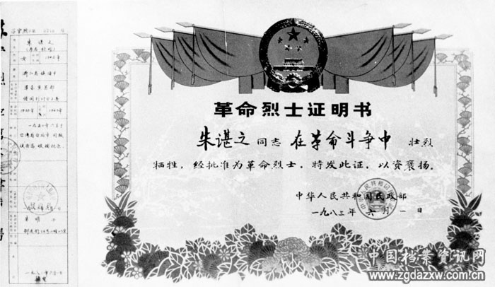 1983年6月1日,民政部颁发的朱谌之(朱枫)革命烈士证明书(影印件)。