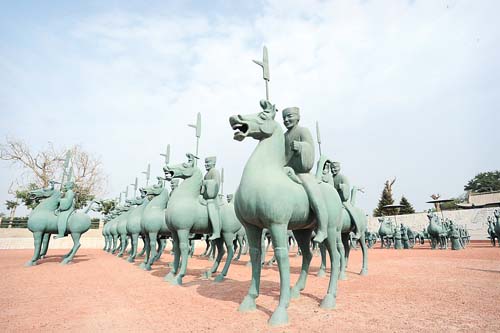 壮哉,武威!随国运张弛,几度雄起衰败。朝代更迭,狼烟与炊烟交幻;世间沧桑,长城共古城依然。中西文化,交融相汇;宗教多彩,西进东渐;商贾云集,八方聚散;中原移民,屯垦戍边。开一片天地,传千秋佳话;留一城文物,存万古镜鉴。铜车马阵、鸠杖汉简、天梯大佛、文庙书匾,六博俑、白马作、铜牦牛、木缘塔,皆中华宝柬;尹娘皇台、大云钟楼、罗什舌塔、海藏隐寺、西夏亥母、雷台道观、祖师高宫、天堂寺院……谁道一朝能建?更张骞使才、去病武略、苏武气节、贾诩谋略、阴铿五律、玄奘宏志、李益七绝、志满功德、章嘉睿智、少穆手楷……流芳百世,际会因缘;张澍、牛鉴、张美如、李于锴等进士举子数百,乃一代风流名士,行迹九州,名垂史编……今日武威,高厦林立,广场阔宽;绿茵有致,街衢井然。马踏飞燕,为中国旅游标志;孔圣文庙,乃陇右学宫之冠。胜景棋布,游人如织;商肆匾额,文采斐然;街头妇幼,笑靥灿烂;晨操晚练,彩装竞艳;霓虹争辉,华灯璀璨,夜市攘攘,行客翩翩……