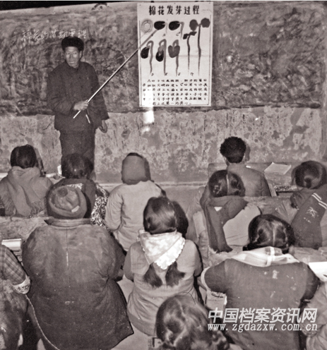 1982年,济宁县廿里铺公社梁营村夜校的老师在讲授棉花发芽过程。