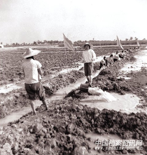 “收麦不盼雨,播谷喜雨来。”在三夏的麦收期间,如果不下一滴雨,那正是农民所期盼的,这样就可保证粮食能安全颗粒归仓;但播种时要是不下雨就会愁坏人,那就不得不动用大量劳力进行农田灌溉了。20世纪70年代,当时建设的排灌站确实发挥了不可替代的重要作用,但因有的农田地高渠深,就不得不采取多种方式把水从灌渠中向农田里提引。当时,虽然有抽水机械,但毕竟农田多,机械少,原始的盆刮、桶泼、打戽斗、摇轱辘、转水车等人力灌溉作业模式也就成为了有力的补充。团结就是力量,在广大农民的齐力灌溉下,一片片水田很快就会被灌足水,插上秧。但实际上,人力灌溉是一项看似轻松,实则“要命”的苦活儿,参加过这种劳动的人曾回忆说:“连续不断的人力提水,会累得要死要活,脚泡在水里时间长了会发白,腿站在水里会凉得打颤,腰酸胳膊疼就别提了,保证你干一天就能累散了架。”可见其劳动强度之大。