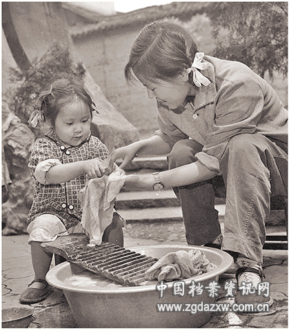 1960年6月1日,一位小姑娘在妈妈的指导下学习洗衣服。 谭铁民 摄