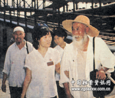 1984年,长沙火车站的站务员搀扶老大爷出站。