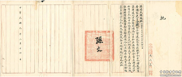 1912年2月14日,关于南京临时政府内务部呈请速颁文官试验令的临时大总统批。 中国第二历史档案馆藏