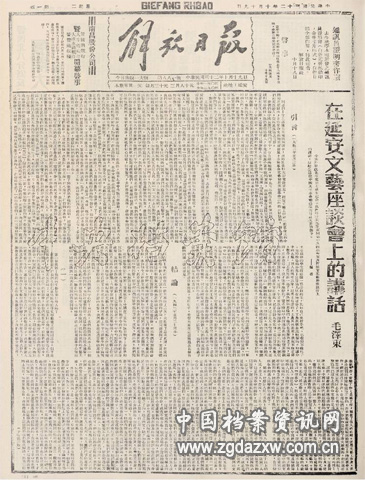 1943年10月19日,在《解放日报》上刊载的毛泽东《在延安文艺座谈会上的讲话》(部分)。