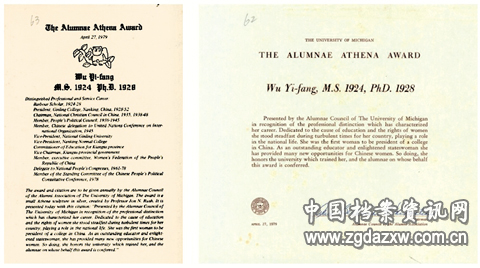 1979年,吴贻芳获得美国密执安大学为世界杰出女性专设的“和平与智慧女神”奖证书。