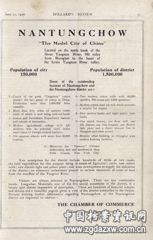美国杂志《世界召唤》在1925年4月刊登了《中国的模范城市》,文章开门见山地指出:南通是独一无二的,在于它是全中国唯一在英文报纸上给自己做广告的城市。这句话曾经引发笔者强烈的兴趣和探索欲望,经过多方探寻,最终于2011年11月,在上海徐家汇藏书楼见到了1920年6月12日的《密勒氏评论报》,翻到第71页,就是《世界召唤》提及的整版广告《南通——中国模范城》。