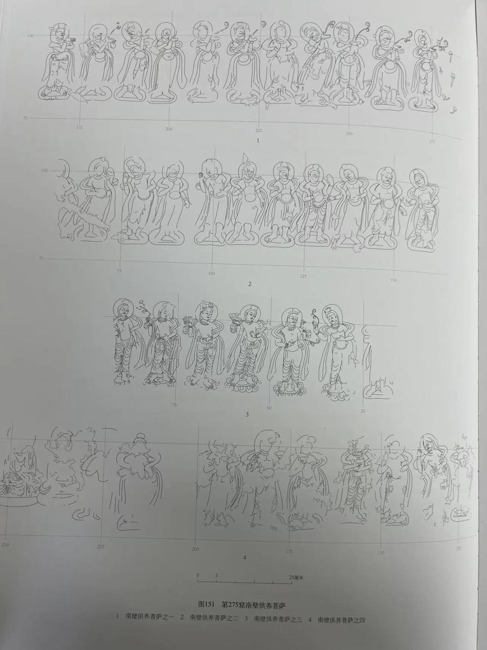 在莫高窟第275窟南壁,仅菩萨就有39身,衣冠服饰基本相同,但姿态手势各异。为了详尽介绍洞窟情况,考古报告里逐一进行了描述: