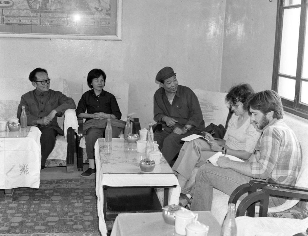 这是樊锦诗(中)等在向美国作家卡兹介绍敦煌艺术的情况(资料图片)。新华社记者张生贵摄