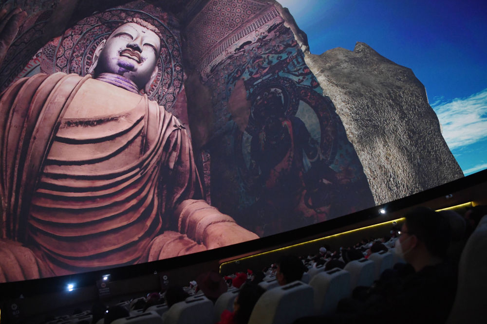 游客在莫高窟数字展示中心观看球幕电影《梦幻佛宫》(3月14日摄)。新华社记者 陈斌 摄