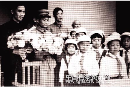 1950年6月1日,少年儿童在庆祝大会上向英模代表献花