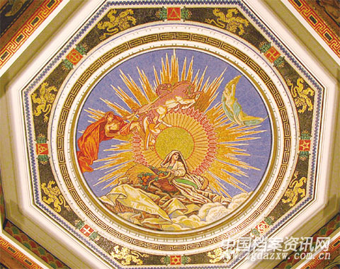这些壁画以彩色马赛克为材料,分别镶嵌在八角厅穹顶和上层壁面。穹顶上的大型壁画幅面达200平方米,堪称巨制,内容取自古希腊神话。画面中心为巨大的太阳和月亮,并嵌有“四海之内皆兄弟”的英文字样,周遭有太阳神、月亮神、谷物神相伴。画面外圈有星座,穹顶下还有8幅大型壁画。据称这些壁画均出自技艺高超的意大利工匠之手。浦东发展银行在修复时将画面中的汇丰银行标志改成了自己的标志。