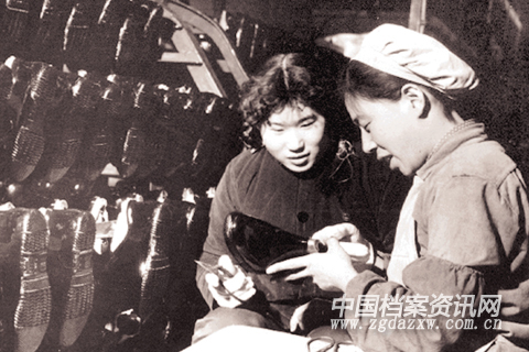 20世纪50年代,大中华橡胶厂套鞋剪口女工君玉如,为了给国家节约外汇,在生产中钻研、创造出“落刀快、收刀快”的新技术。 上海市档案馆藏