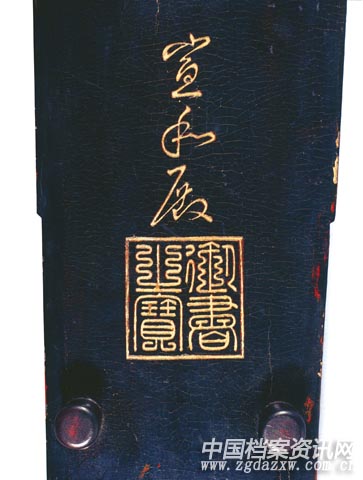 在“金钟”琴的龙池下方刻有草书“宣和殿”三字,其下为九叠文“御书之宝”印章。这说明“宣和殿”三字可能为宋徽宗亲笔书写。