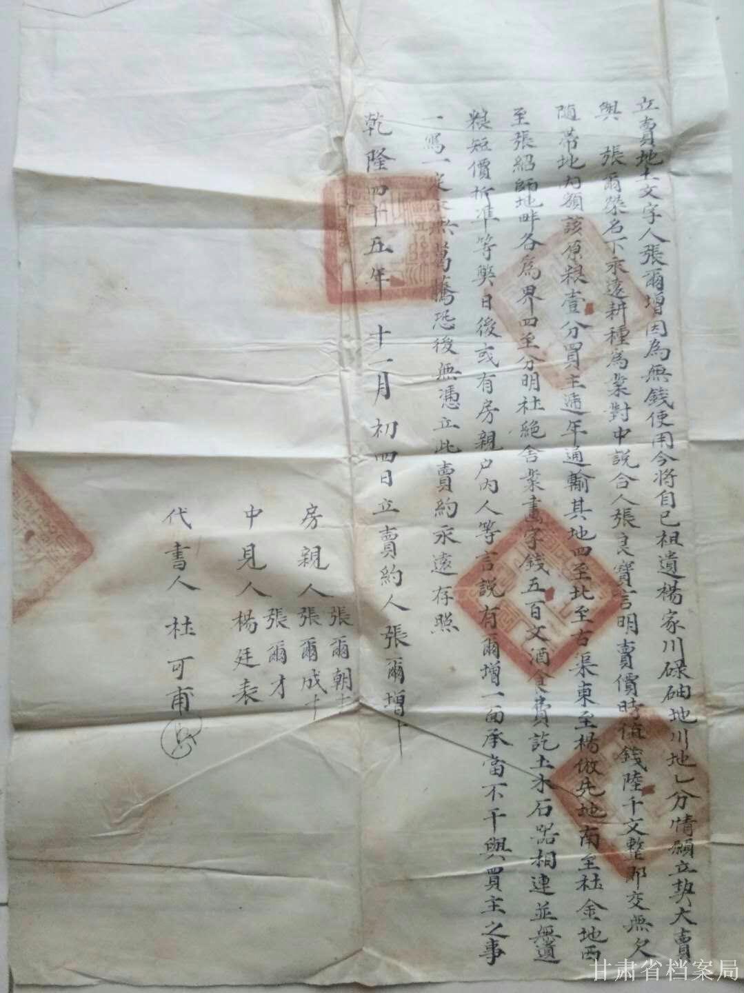今年以来,徽县档案局多措并举,全力征集民间珍贵史料,近日收集到清代清乾隆四十五年、嘉庆六年、道光七年和咸丰六年买卖土地契约副本3幅,该契约由麻沿河党政初中教师张芳学捐赠。
