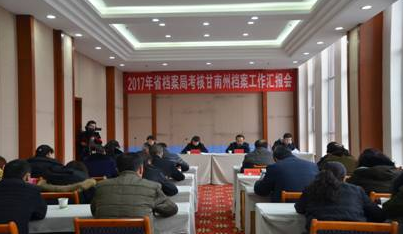 在汇报会上,州档案局局长崔庆春做了工作汇报,省档案局副处长赵洁和韩斌分别对考核工作反馈了意见。宋彩萍副巡视员作了重要讲话。她对2017年甘南州档案工作给予了肯定,一是甘南州委、州政府领导高度重视档案工作,主要领导积极协调解决困难问题;二是全体档案工作者扎实工作,今年的档案工作有明显进步,比往年的工作有了很大的进展,尤其是寺庙档案的管理工作特色明显;三是档案整理规范、收集齐全 ,为今后规范管理达标升级打下了良好基础。