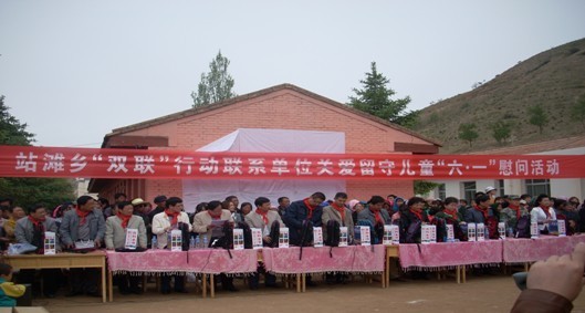 5月31日,临洮县档案局等站滩乡“双联”行动联系单位组成慰问小组集中开展了“六一”节慰问活动。在活动仪式上,联系单位为部分贫困儿童送去书包、百科全书等学习用品,同时还为10名留守儿童每人送去现金200元,并为站滩中心小学送去鼓、号等音乐器材。